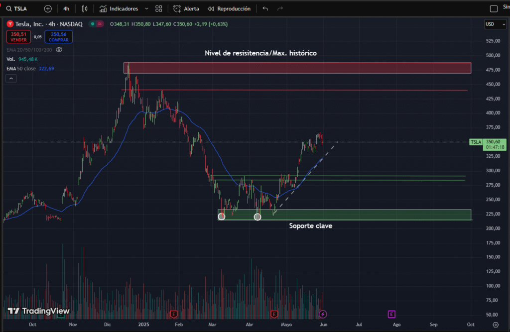 Ahora que conocés todos los factores que llevaron a las acciones de Tesla a su precio actual, la siguiente sección trae un análisis técnico que resalta su tendencia, los niveles clave y las perspectivas para lo que viene.